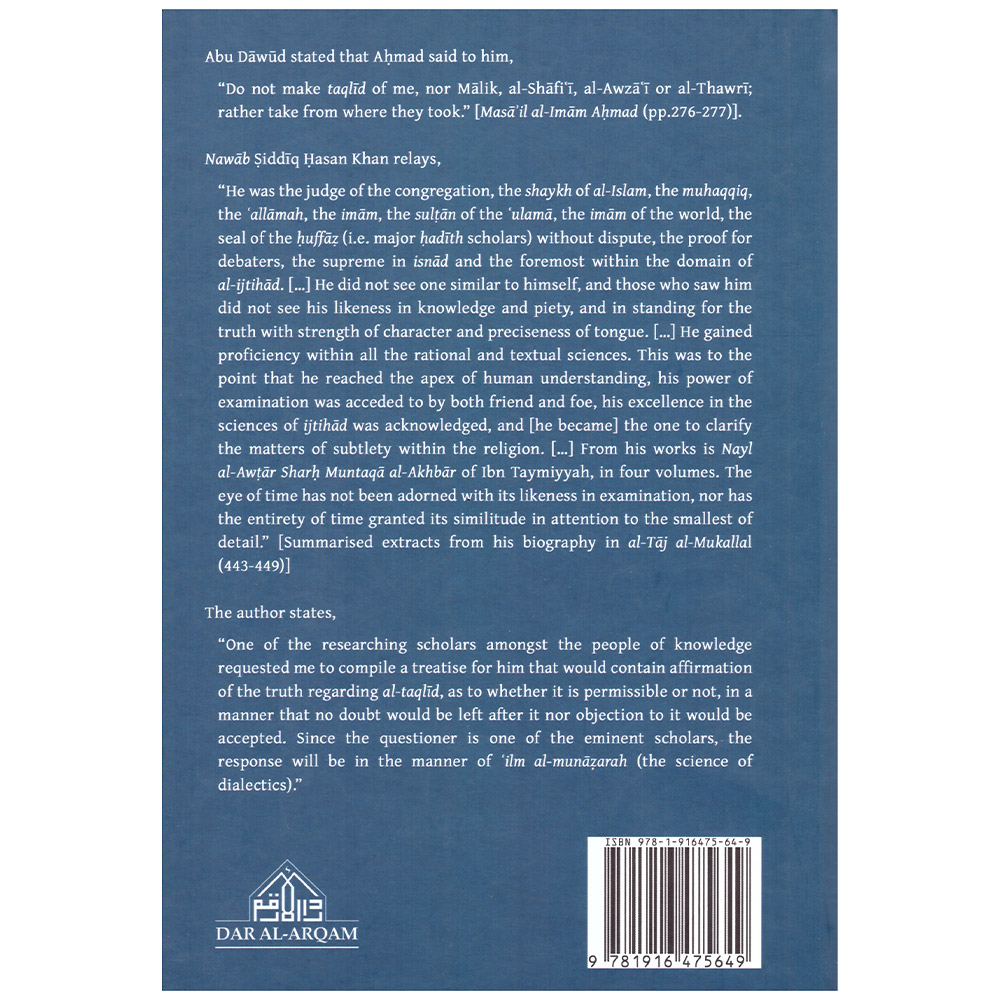 The author states, “One of the researching scholars amongst the people of knowledge requested me to compile a treatise for him that would contain affirmation of the truth regarding al-taqlīd, as to whether it is permissible or not, in a manner that no doubt would be left after it nor objection to it would be accepted. Since the questioner is one of the eminent scholars, the response will be in the manner of ilm al-munāẓarah (the science of dialectics).”