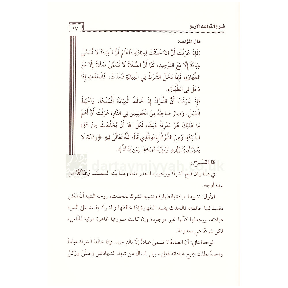 رسالة مختصرة كتبها الإمام المجدد شيخ الإسلام محمد بن عبد الوهاب – رحمه الله – وقد اشتملت على تقرير ومعرفة قواعد التوحيد, وقواعد الشرك, ومسألة الحكم على أهل الشرك, والشفاعة المنفية والشفاعة المثبتة. وهذه القواعد الأربع مأخوذة من نصوص الكتاب والسنة ومن معرفة حال العرب. فإذا عرفت هذه القواعد وفهمتها سهُل عليك بعد ذلك معرفة التوحيد الذي بعث الله به رسله