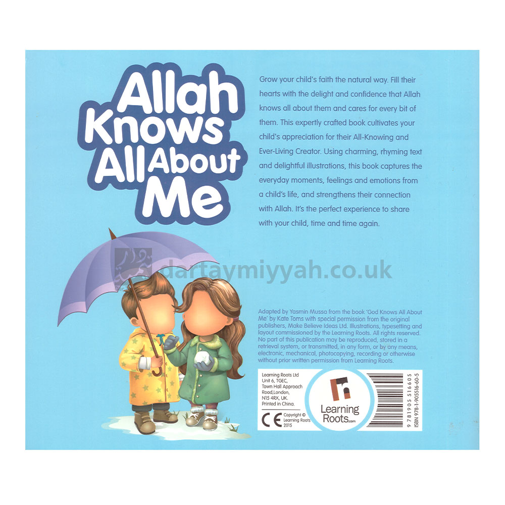 - This book is written using charming rhyming text with the repeated phrase ‘Allah knows all about me,’ which reinforces your child’s faith in their Creator with the turn of every page.