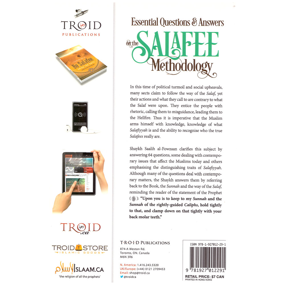 Shaykh Saalih al-Fowzaan clarifies this subject by answering 64 questions, some dealing with contemporary issues that affect the Muslims today and others emphasising the distinguishing traits of Salafiyyah. Although many of the questions deal with contemporary matters, the Shaykh answers them by referring back to the Book, the Sunnah and the way of the Salaf, reminding the reader of the statement of the Prophet, “Upon you is to keep to my Sunnah and the Sunnah of the rightly-guided Caliphs, hold tightly to that, and clamp down on that tightly with your back molar teeth.”