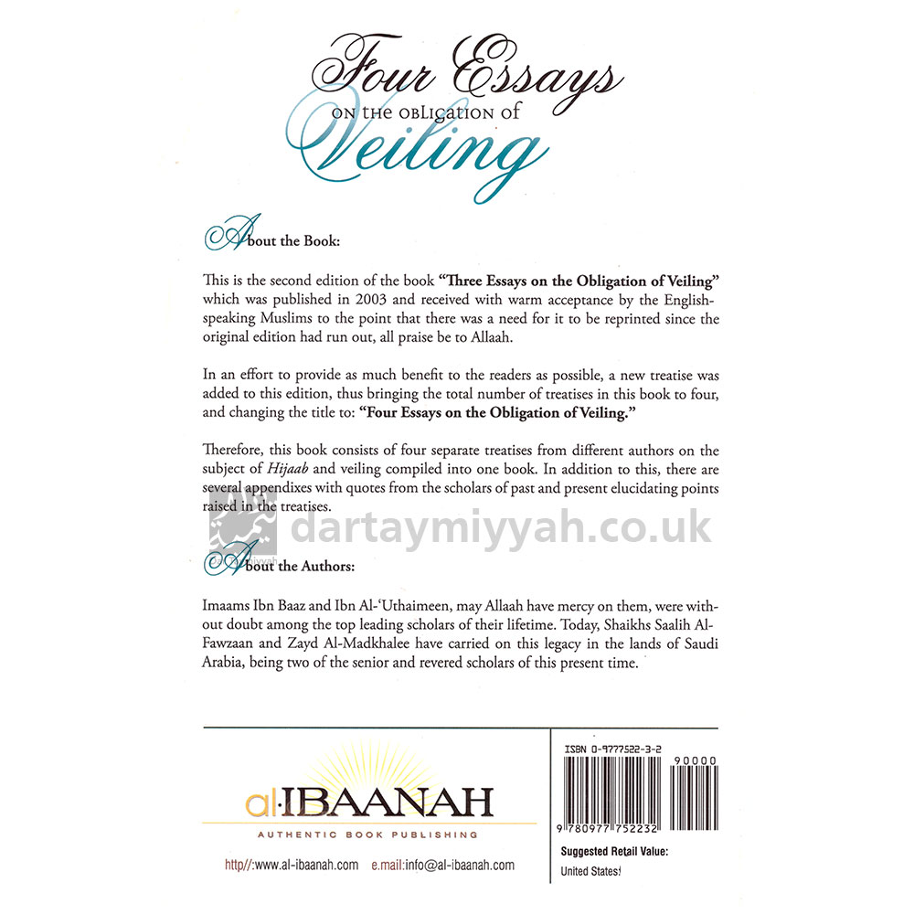 This is the second edition of the book “Three Essays on the Obligation of Veiling” which was published in 2003 and received with warm acceptance by the English-speaking Muslims to the point that there was a need for it to be reprinted since the original edition has run out, all praise be to Allaah. In an effort to provide as much benefit to the readers as possible, a new treatise was added to this edition bringing four separate treatises from different authors on the subject of Hijaab and veiling compiled into one book. In addition to this, there are several appendixes with quotes from the scholars of past and present elucidating points raised in the treatises.